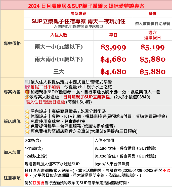 註:依專案人數體驗「日月潭親子SUP立槳課程」(1.5小時) 含森林步道探險、SUP自由體驗、教練隨團側拍及戒護、水上補魚蝦體驗、水中生態解說、簡易溫水盥洗。SUP立槳限入住日與退房日兌換體驗,現場臨時加人但不下水體驗SUP,需加每人$300平台保險費用。預約體驗表單(點我前往