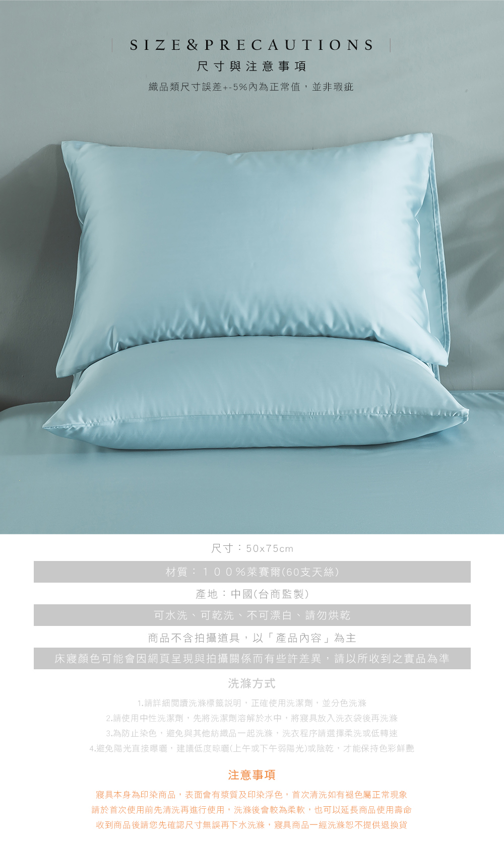 ◆產品內容:◎內容:60支天絲枕套(此賣場僅販售枕套,不含床包被套)◎材質:100%萊賽爾(60支天絲)◎尺寸:50x75cm(+-5%)◎產地:中國(台商監製)◆注意事項:◎清潔保養方式:可水洗、可乾洗、不可漂白、不可烘乾◎建議清洗時,先將洗劑溶解於水中,再將床寢放入大型洗衣袋後再清洗◎本商品不含拍攝道具,以「產品內容」為主◆產品顏色可能會因網頁呈現與拍攝關係而有些許差異,請以所收到之實品為準。