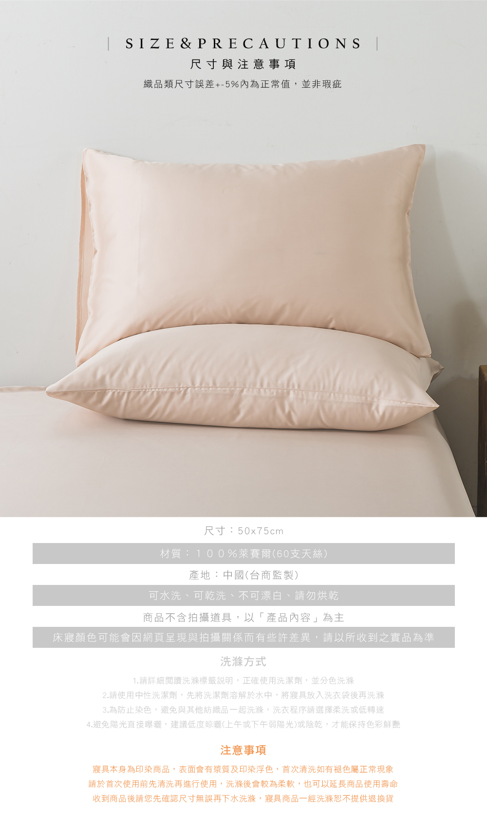 ◆產品內容:◎內容:60支天絲枕套(此賣場僅販售枕套,不含床包被套)◎材質:100%萊賽爾(60支天絲)◎尺寸:50x75cm(+-5%)◎產地:中國(台商監製)◆注意事項:◎清潔保養方式:可水洗、可乾洗、不可漂白、不可烘乾◎建議清洗時,先將洗劑溶解於水中,再將床寢放入大型洗衣袋後再清洗◎本商品不含拍攝道具,以「產品內容」為主◆產品顏色可能會因網頁呈現與拍攝關係而有些許差異,請以所收到之實品為準。