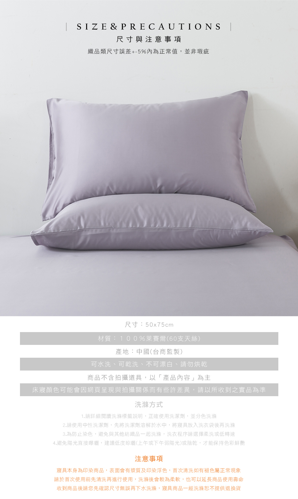 ◆產品內容:◎內容:60支天絲枕套(此賣場僅販售枕套,不含床包被套)◎材質:100%萊賽爾(60支天絲)◎尺寸:50x75cm(+-5%)◎產地:中國(台商監製)◆注意事項:◎清潔保養方式:可水洗、可乾洗、不可漂白、不可烘乾◎建議清洗時,先將洗劑溶解於水中,再將床寢放入大型洗衣袋後再清洗◎本商品不含拍攝道具,以「產品內容」為主◆產品顏色可能會因網頁呈現與拍攝關係而有些許差異,請以所收到之實品為準。