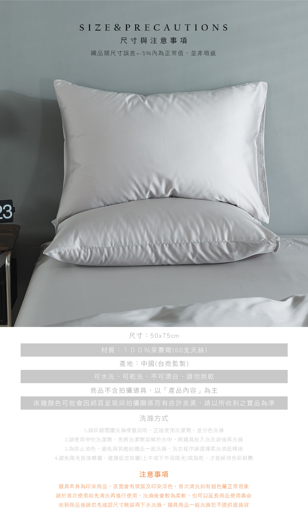 ◆產品內容:◎內容:60支天絲枕套(此賣場僅販售枕套,不含床包被套)◎材質:100%萊賽爾(60支天絲)◎尺寸:50x75cm(+-5%)◎產地:中國(台商監製)◆注意事項:◎清潔保養方式:可水洗、可乾洗、不可漂白、不可烘乾◎建議清洗時,先將洗劑溶解於水中,再將床寢放入大型洗衣袋後再清洗◎本商品不含拍攝道具,以「產品內容」為主◆產品顏色可能會因網頁呈現與拍攝關係而有些許差異,請以所收到之實品為準。