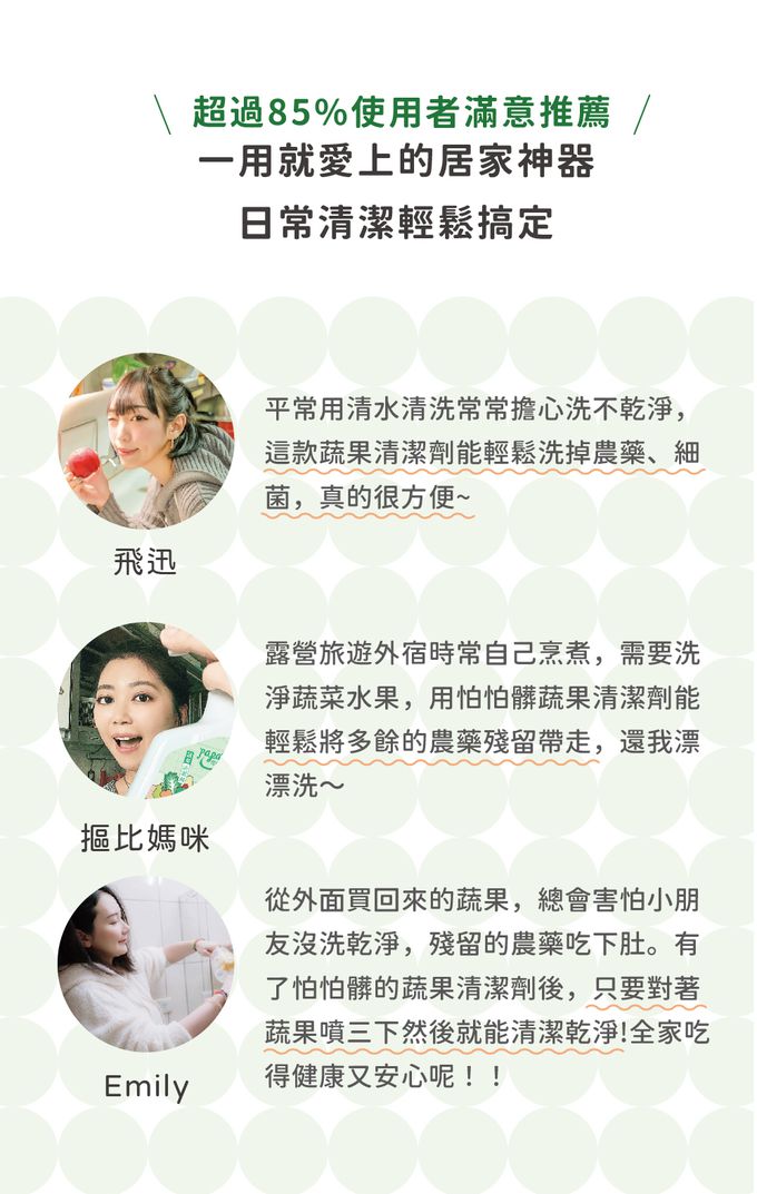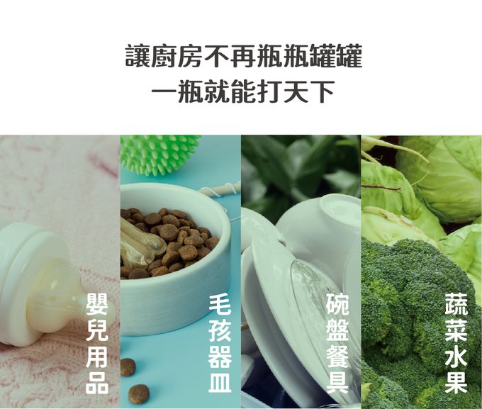 注意事項:本產品添加植物精萃成份,請勿稀釋本產品或直接將水加入,以確保產品配方完整性。產品偶有沉澱、濃稠變化或噴頭呈現白色粉末結晶皆屬自然現象,請安心使用。本產品不可食用或用於食品添加,請放置兒童不易取得之處,避免誤食危險。如有不慎誤入眼睛,請以大量清水沖洗並評估是否送醫。