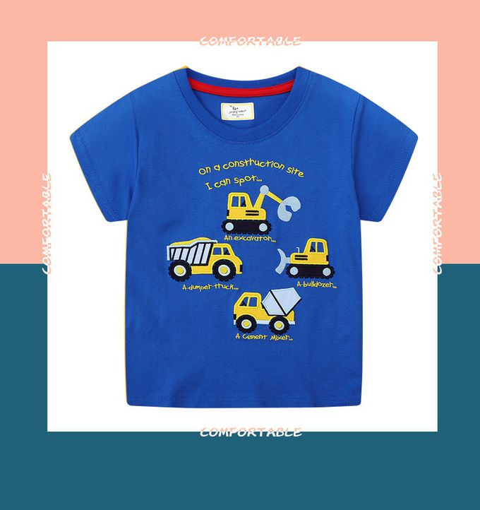 Jumping meters - 棉質圓領短袖上衣-恐龍工程車-白色