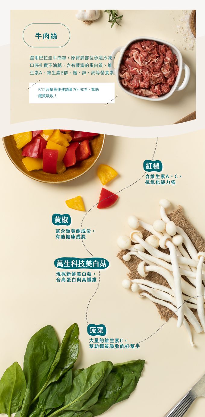 成分:雞高湯[水,雞骨(台灣),蔥,姜],菠菜,牛肉(巴拉圭),美白菇,黃椒,紅椒,樹薯澱粉,醬油[水,非基改黃豆(高蛋白豆片),小麥,食鹽],姜,大豆油,碘鹽,馬鈴薯粉,糖,味霖[米麹調味液(水,米,米麴,釀造酢,鹽),甘蔗液糖,釀造酢,鹽],洋蔥粉,白胡椒粉,蒜粉