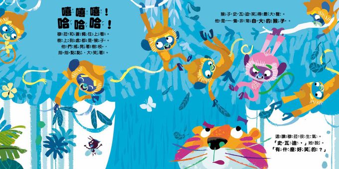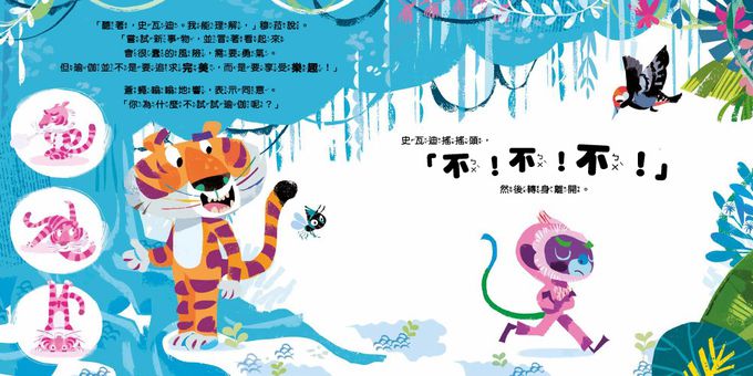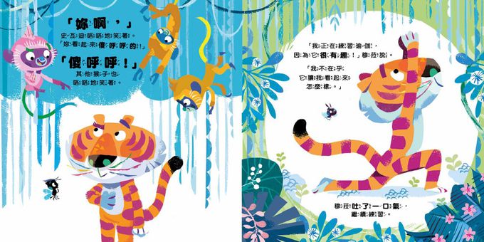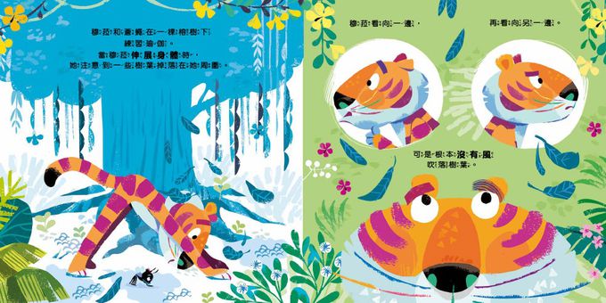 而這一次,改由老虎穆拉來帶領新夥伴──猴子史瓦迪,希望能用瑜伽活動,讓自大的他學習專注傾聽,並懂得自我反思。這一次的畫面呈現,同樣有著各種動物角色生動無比的動態姿勢,讓讀者大呼可愛療癒之外,也讓我們得以跟著劇情一同思考,檢視自我的情緒和人際互動狀況:自己是不是有時也會像猴子一樣,因為一些小事而嘲笑別人,是不是也有機會,利用一些簡易的小活動,來改善及反思自己的各項表現呢?