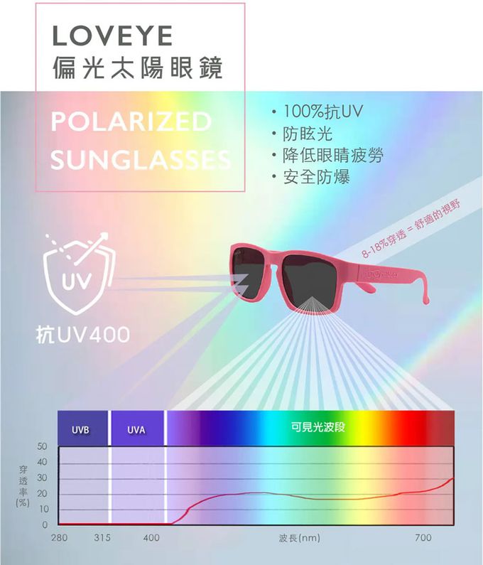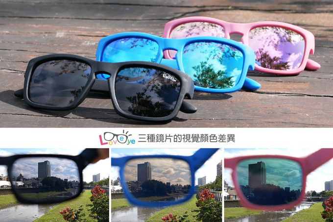 當陽光照射在物體上,再被反射/散射出來就會造成眩目的亂反射光,偏光鏡片就像百葉窗一樣,能夠將造成視覺不適的眩光過濾掉,到雪地、海邊等容易有大面積反射光地方活動等,都很適合配戴偏光鏡片。要測試墨鏡是否是偏光鏡片,只需要將對著3C螢幕旋轉,到某個角度會全黑、繼續轉會變清晰就是真的偏光鏡片喔!Loveye的鏡面偏光鏡片是額外增加的電鍍塗層,抗UV功能與黑色鏡片一致。