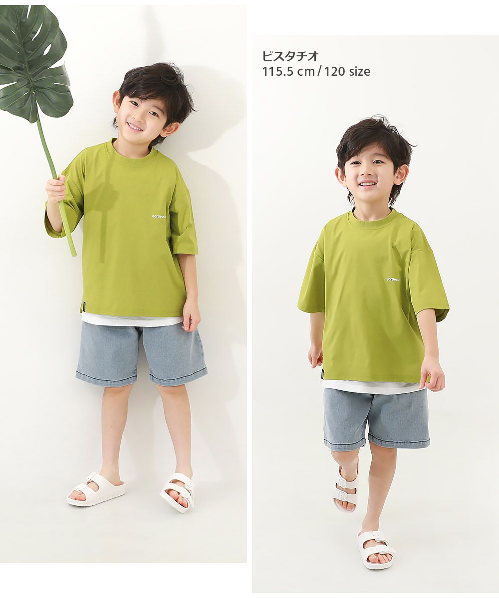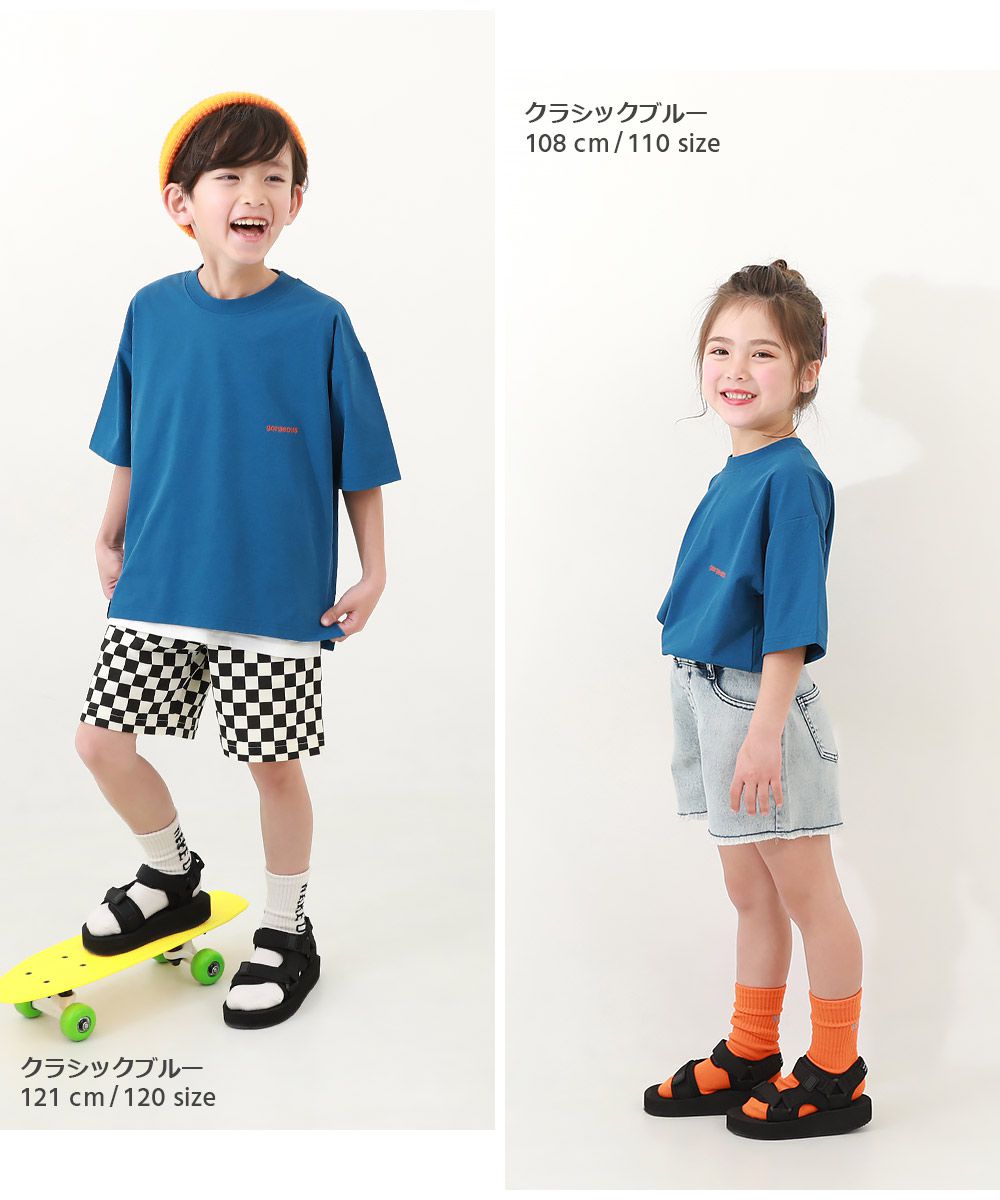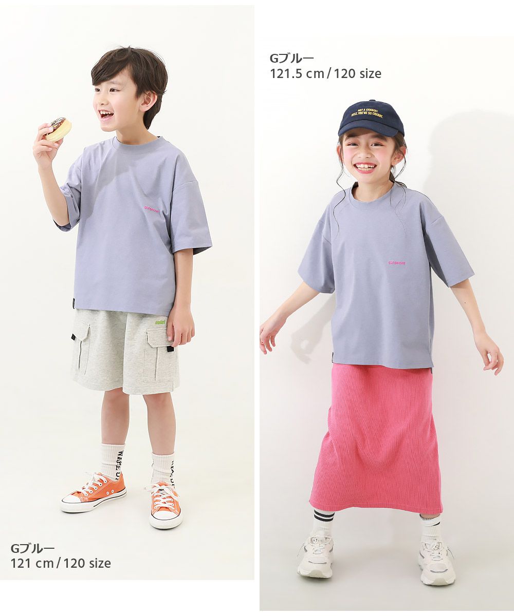日本 devirock - 背後標語印花落肩短袖上衣-藍綠底黃字
