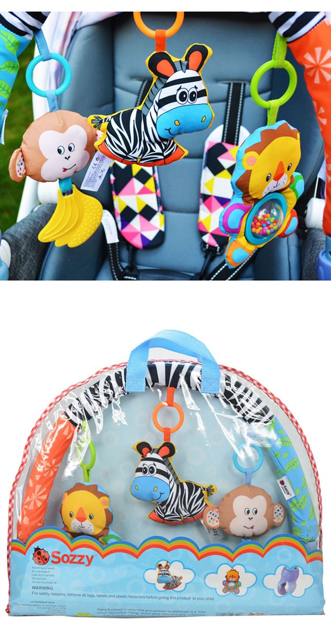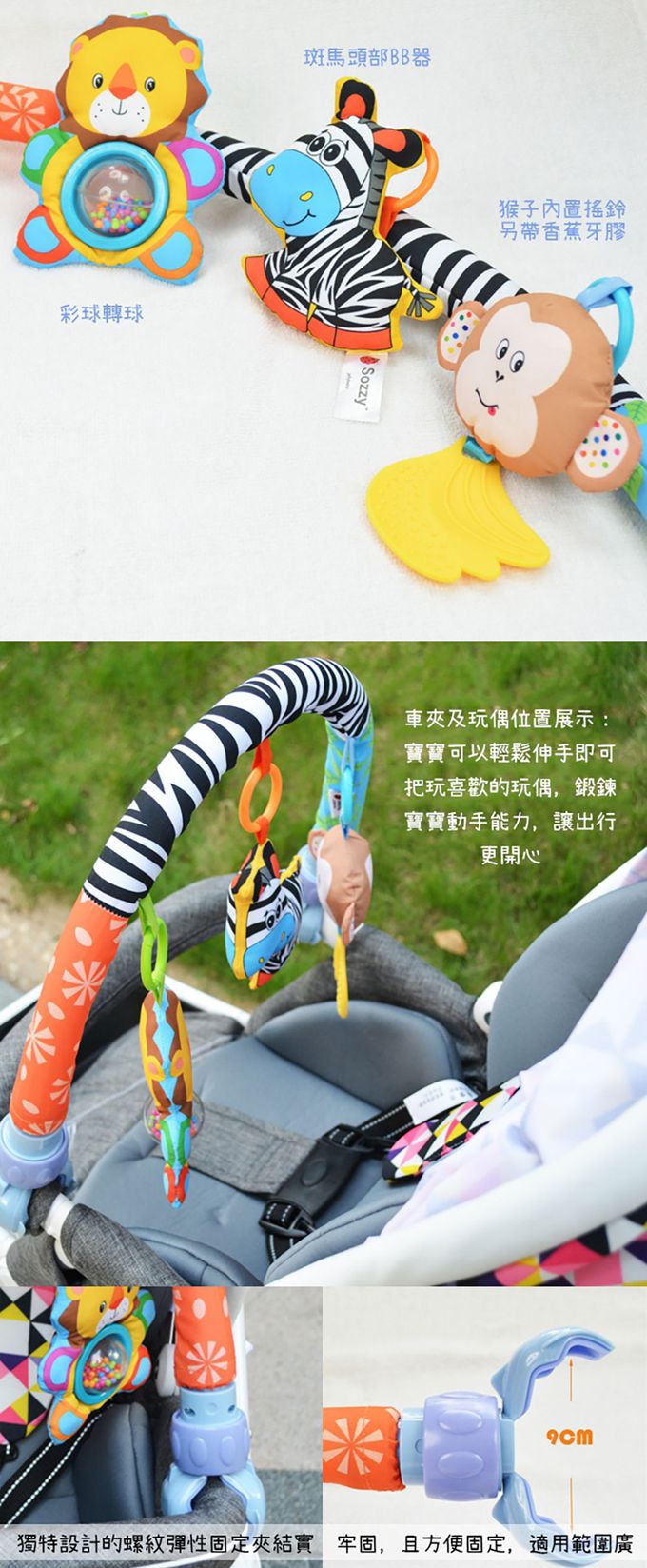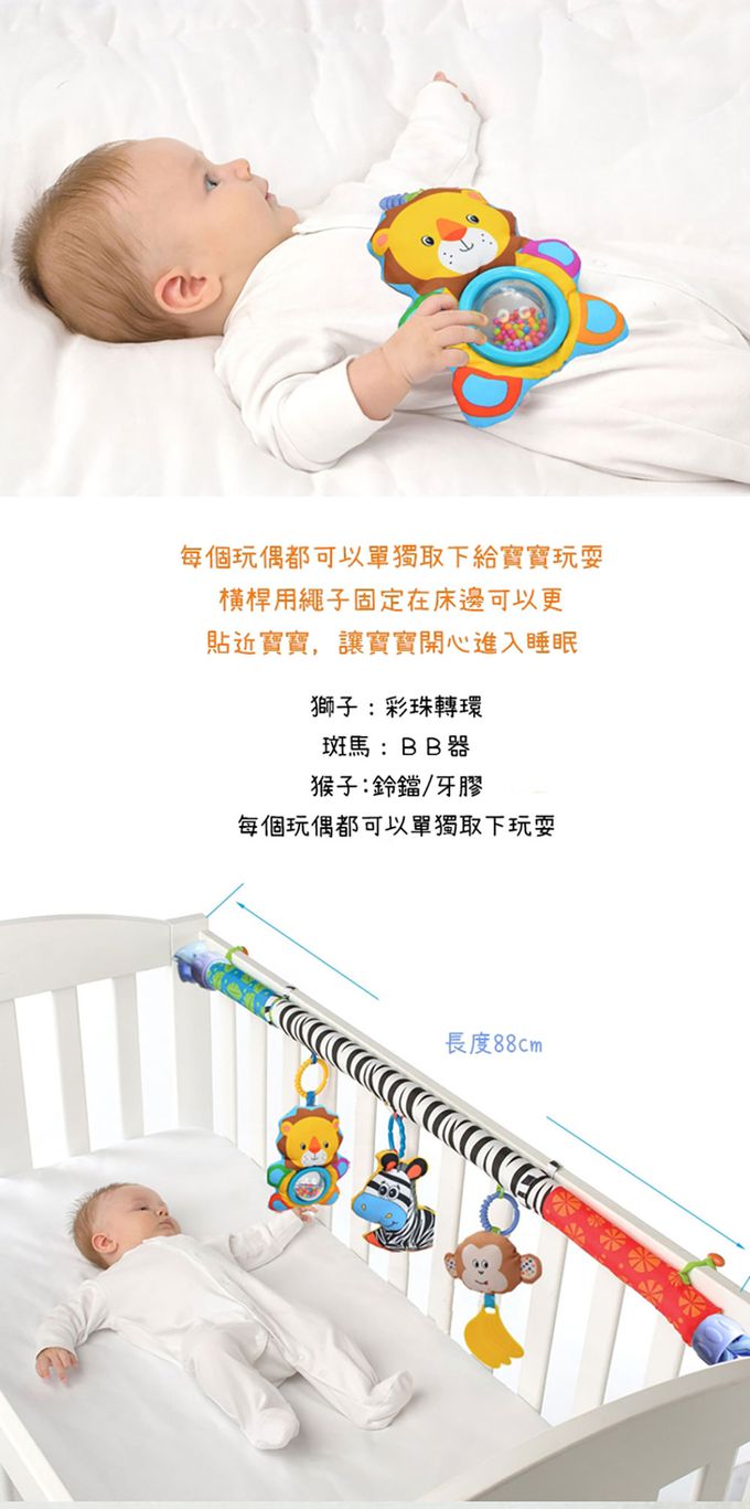 1.獅子:彩珠轉環/斑馬:BB器/猴子:鈴鐺/牙膠,每個玩偶都可以單獨取下玩耍喔。