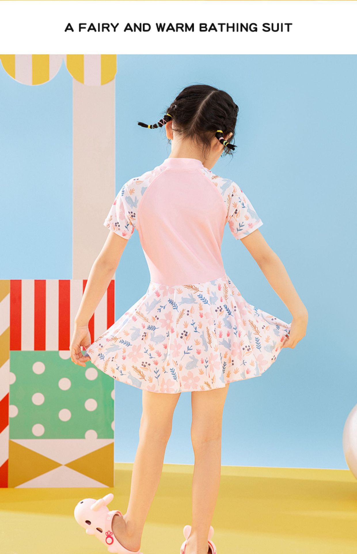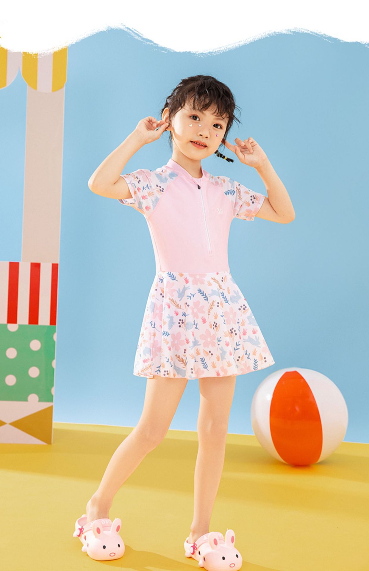 361° - 兒童甜美風短袖連身裙泳衣-小花朵-淺粉色