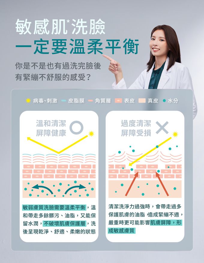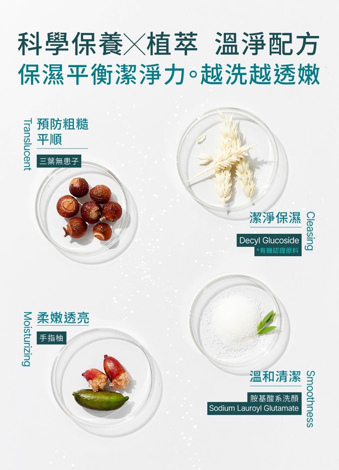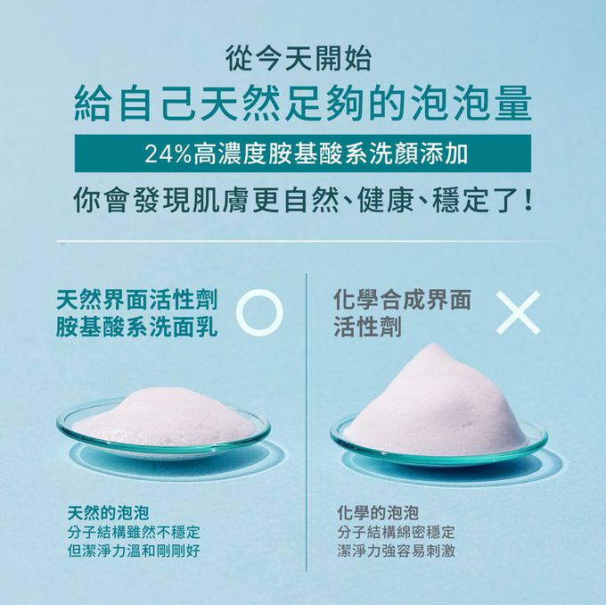 使用方式:從來體驗過的舒適洗臉感受,洗後不緊繃,像保養過一樣 .24%高濃度胺基酸系洗顏添加 .重現原生肌+75%、溫和不緊繃99%、舒緩柔嫩93% .嚴選植萃柔嫩保濕成分:三葉無患子、手指柚...等 .為了不添加防腐劑,採用防止逆流軟管,零空氣接觸避免細菌滋生 ☑︎ 高規檢測:通過德國權威高標「敏感肌0刺激安心」檢測 ☑︎ 高成本真空瓶:零空氣接觸避免細菌滋生,不用添加化工防腐劑