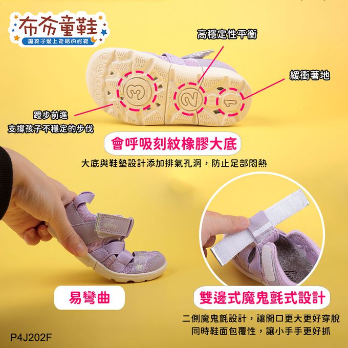 .雙邊式魔鬼氈設計,讓開口更大更好穿脫,同時鞋面包覆性,讓小小手更好抓