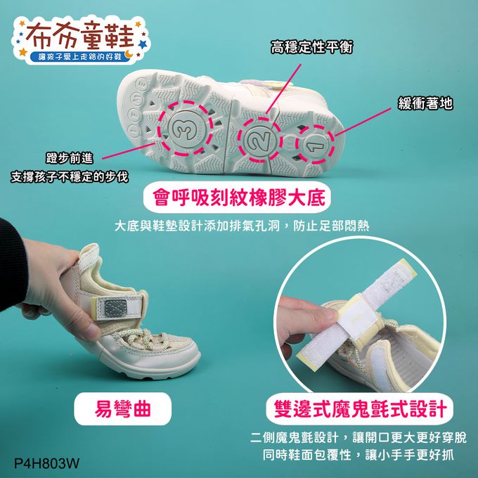 .雙邊式魔鬼氈設計,讓開口更大更好穿脫,同時鞋面包覆性,讓小小手更好抓