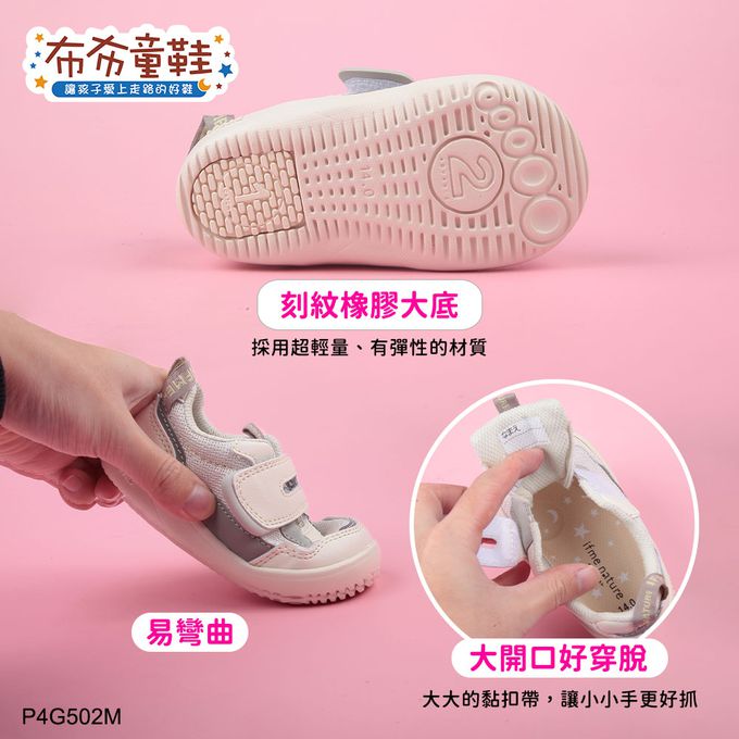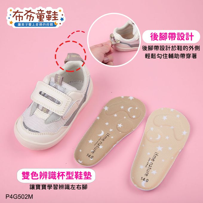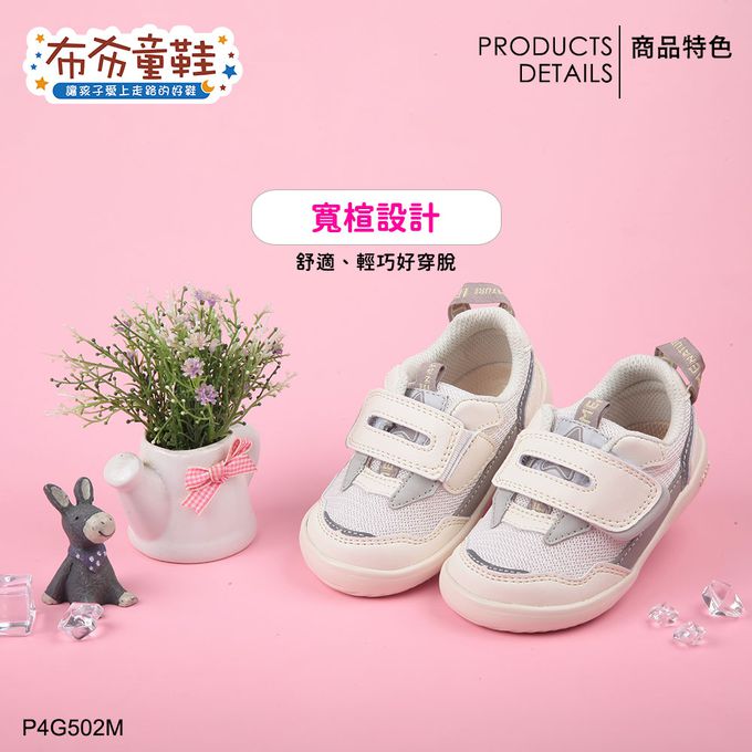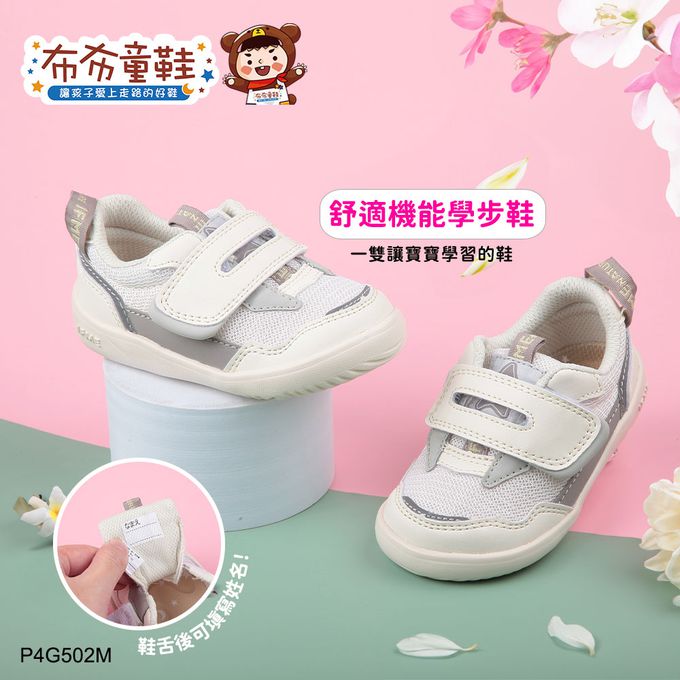 .舒適機能學步鞋,一雙讓寶寶學習走路的鞋.寬楦設計,鞋舌後可以寫上自己的名字.凹凸刻紋橡膠鞋底,採易彎曲設計.網布設計,透氣不悶熱.雙色杯型鞋墊,讓寶寶學習辨識左右腳