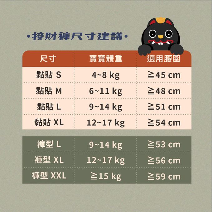 L號:適用於 9~14kg,腰圍 ≧ 53cm