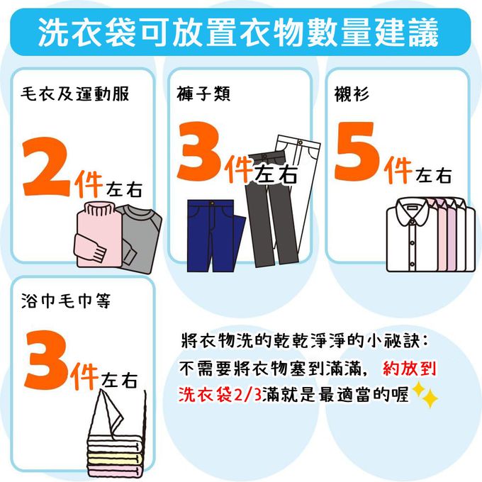【洗滌基準】※依衣物之設計、材質會有所不同。●襯衫約5件。●褲子約3件。●毛衣、運動衫約2件。●浴巾約3條。