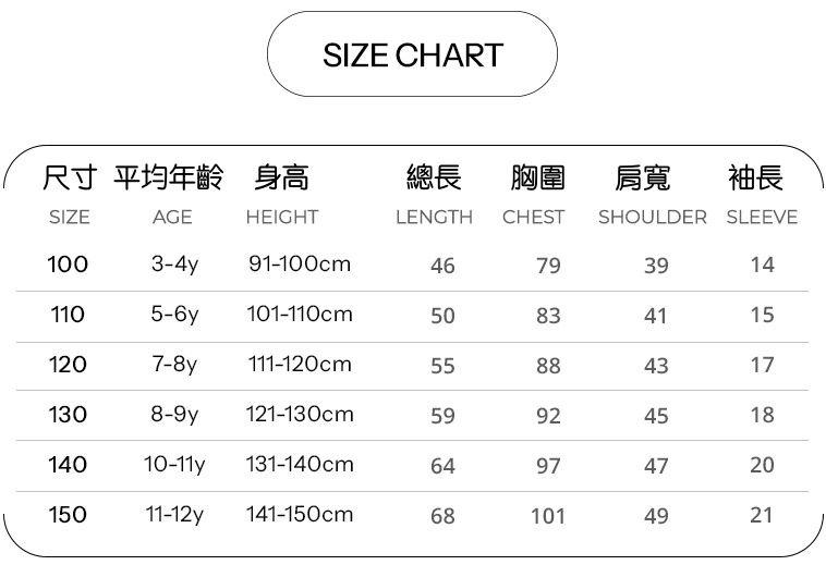 尺寸從90-150公分都有,大小孩和小寶貝都可以穿!
