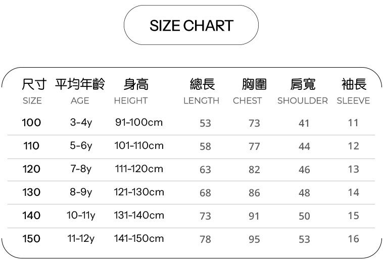 尺寸從90-150公分都有,大小孩和小寶貝都可以穿!