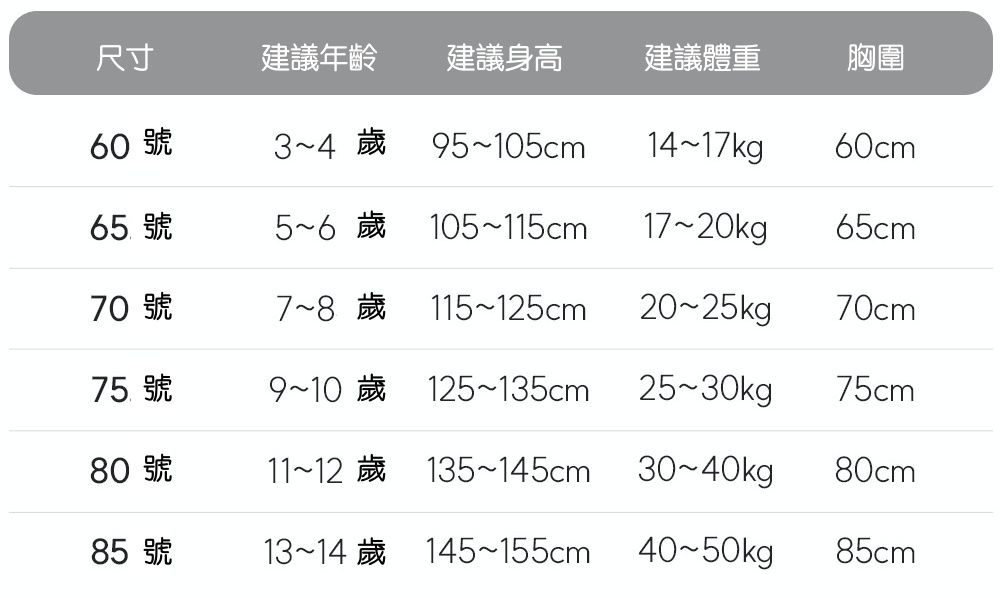 60[實歲2-3Y]、65[實歲4-5Y]、70[實歲6-7Y]、75[實歲8-9Y]、80[實歲10-11Y]、85[實歲12-13Y]