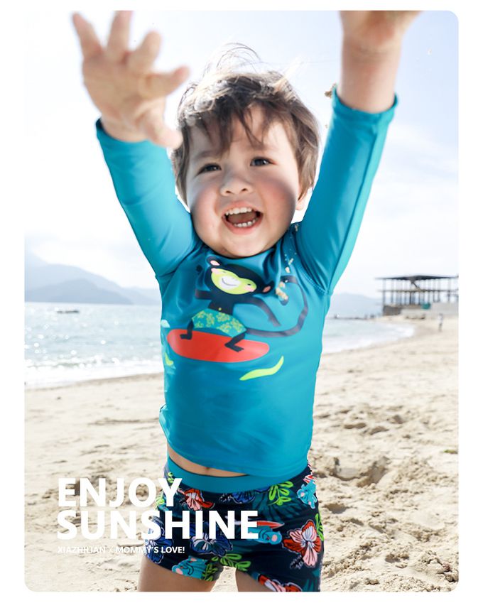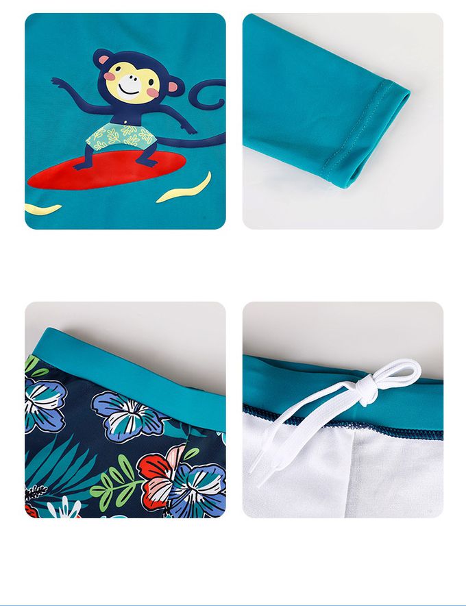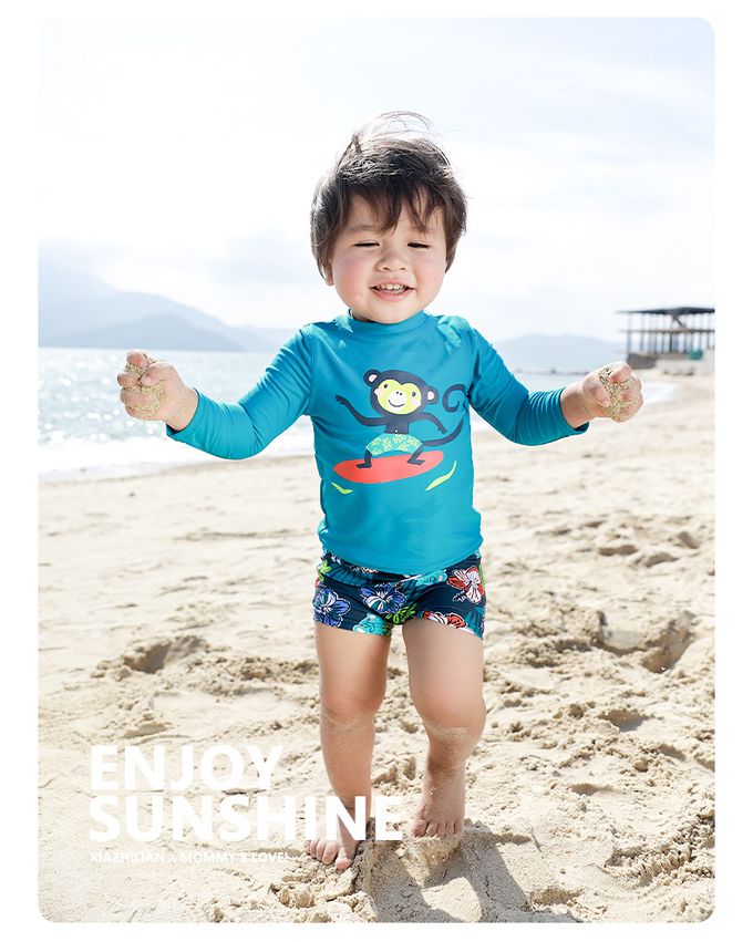 男寶防曬長袖泳裝套裝(附帽子)-猴子衝浪-藍綠色