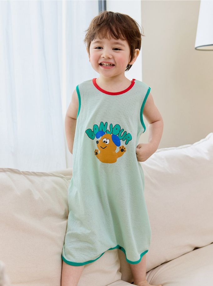 韓國 Cordi-i - 無螢光棉透氣洞洞連身防踢被-打招呼狗狗-湖水綠