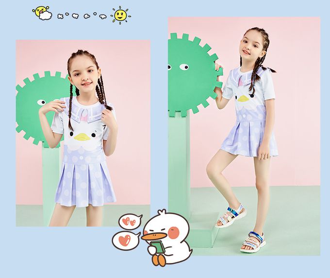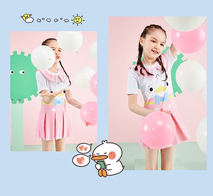 女寶小翻領短袖百褶裙連身泳衣-可愛鴨鴨-粉色