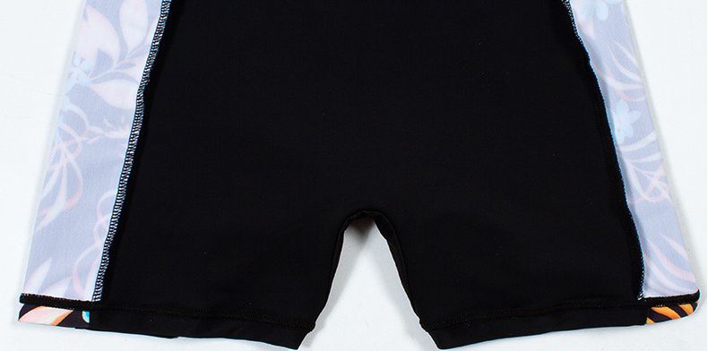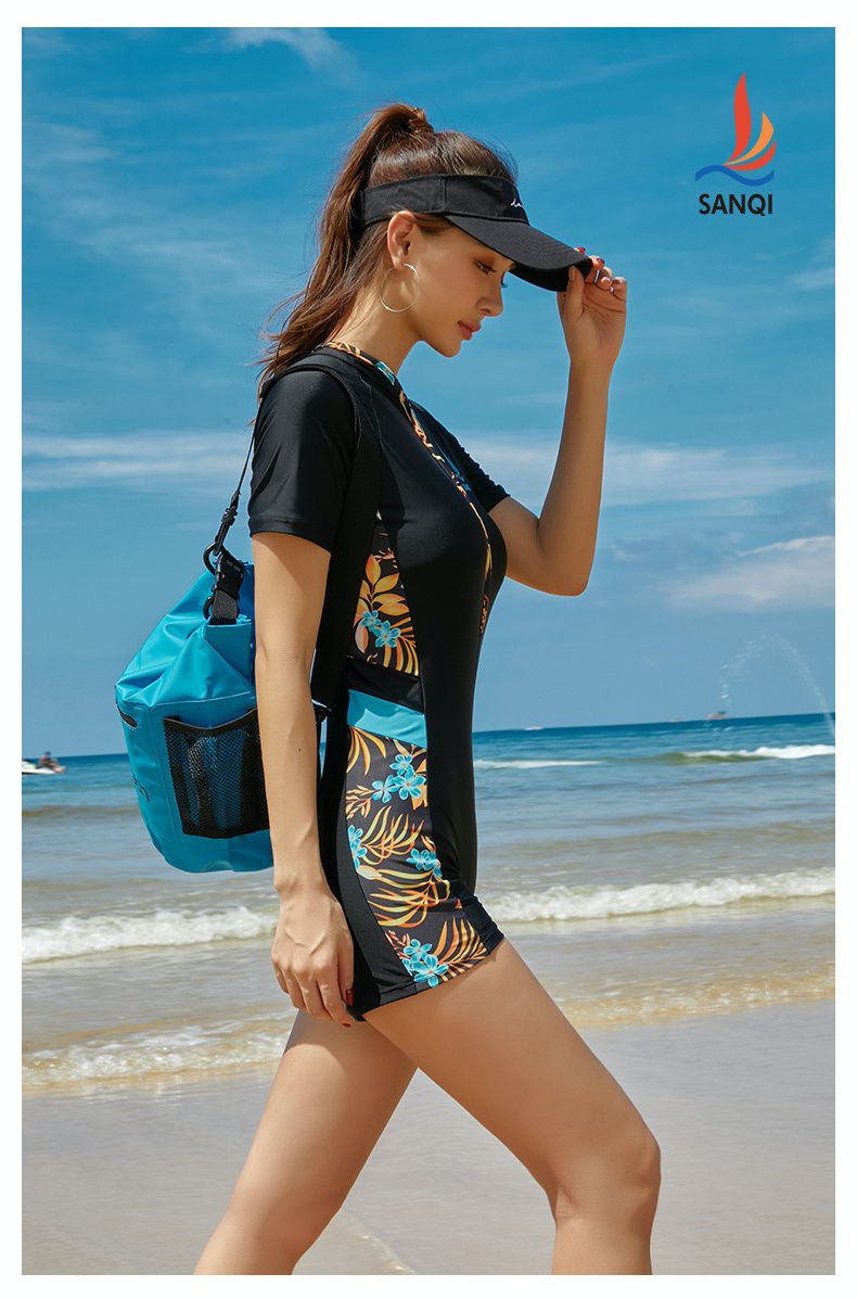 SANQI - 顯瘦復古印花短袖連身泳衣-黑色
