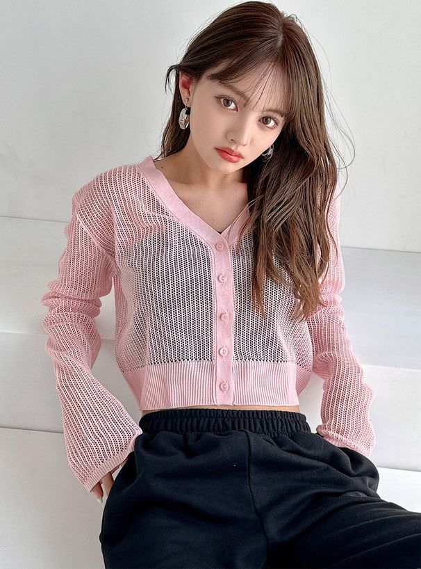 日本 GRL - 春日短版鏤空針織開襟衫-粉紅 (F)