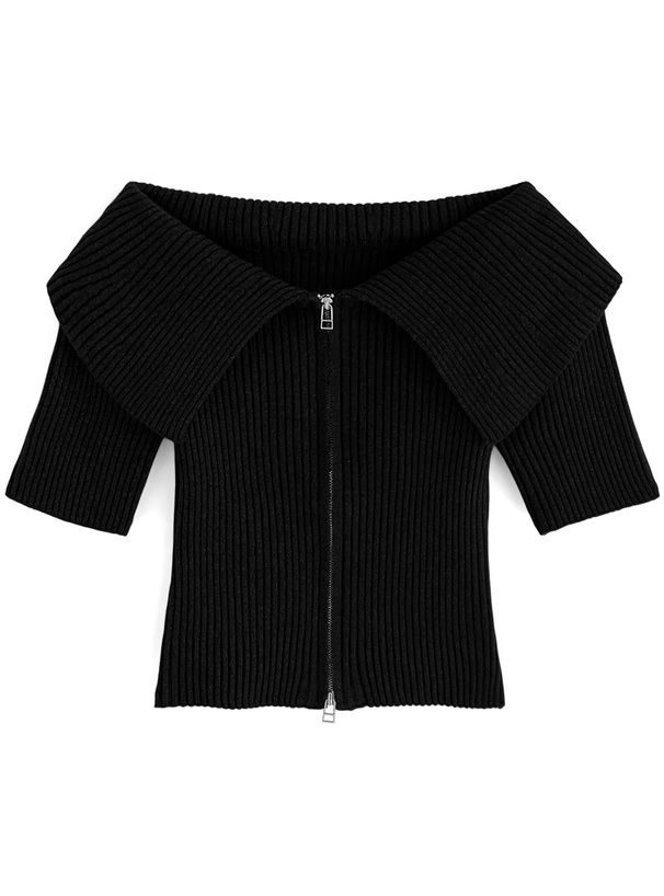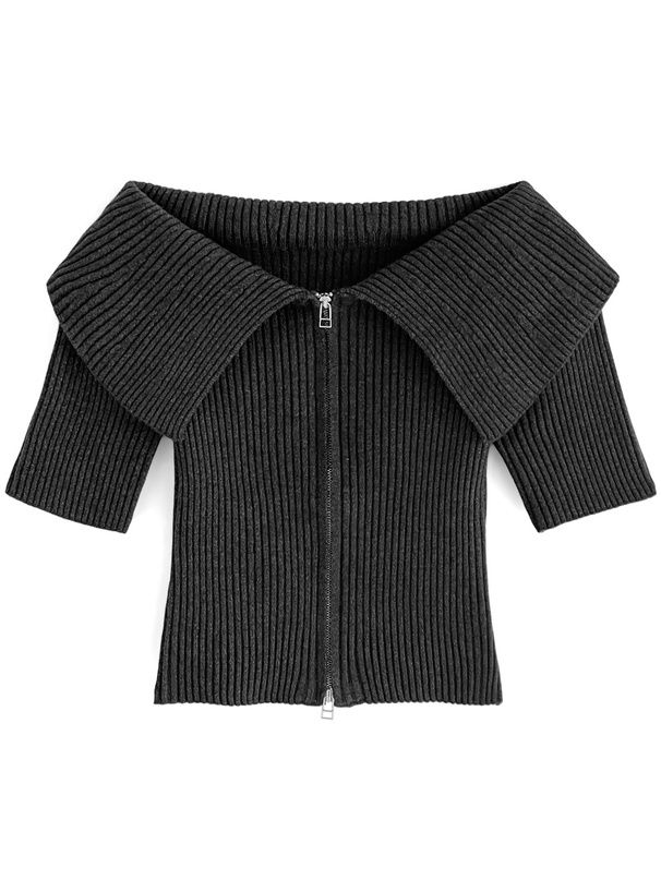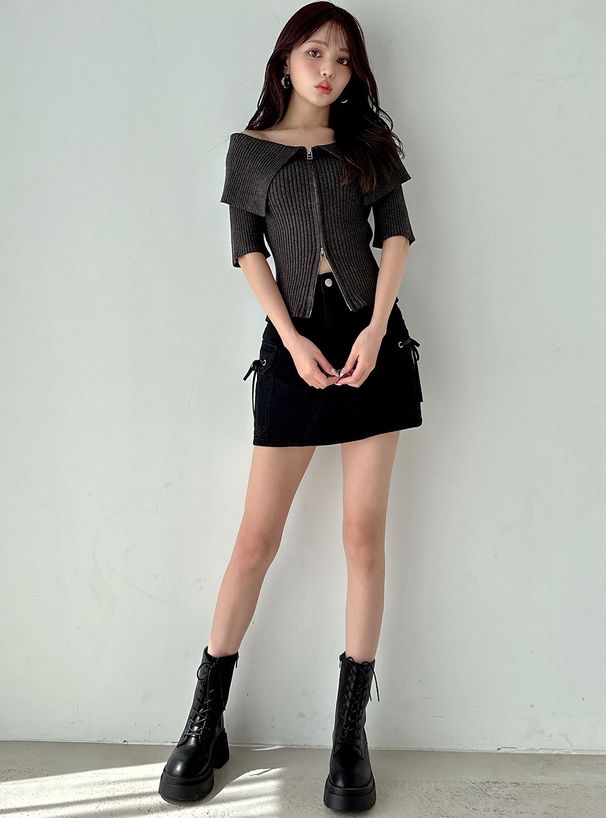 日本 GRL - 露肩大翻領雙拉鍊短袖上衣-深灰