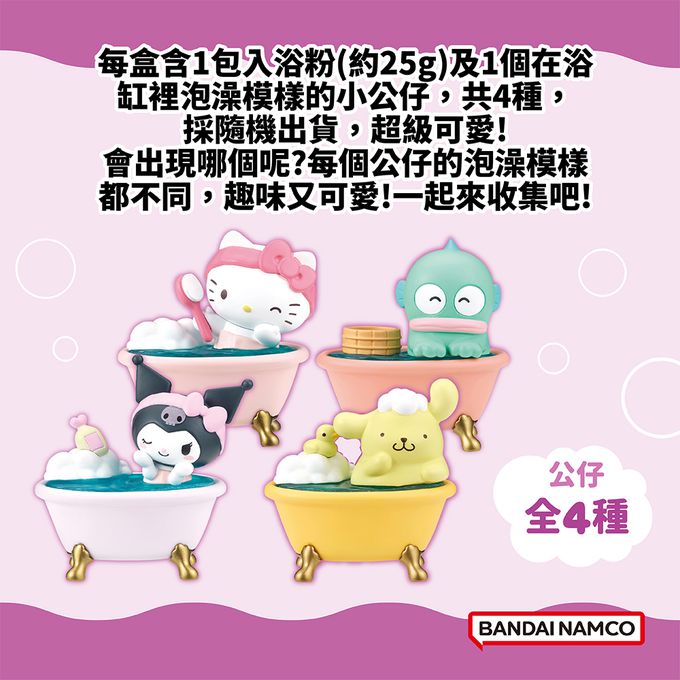 每盒含1包入浴粉(約25g)及1個三麗鷗家族角色的小公仔,共4種,採隨機出貨,超級可愛!每個公仔的泡澡模樣都不同,趣味又療癒!一起來收集吧!