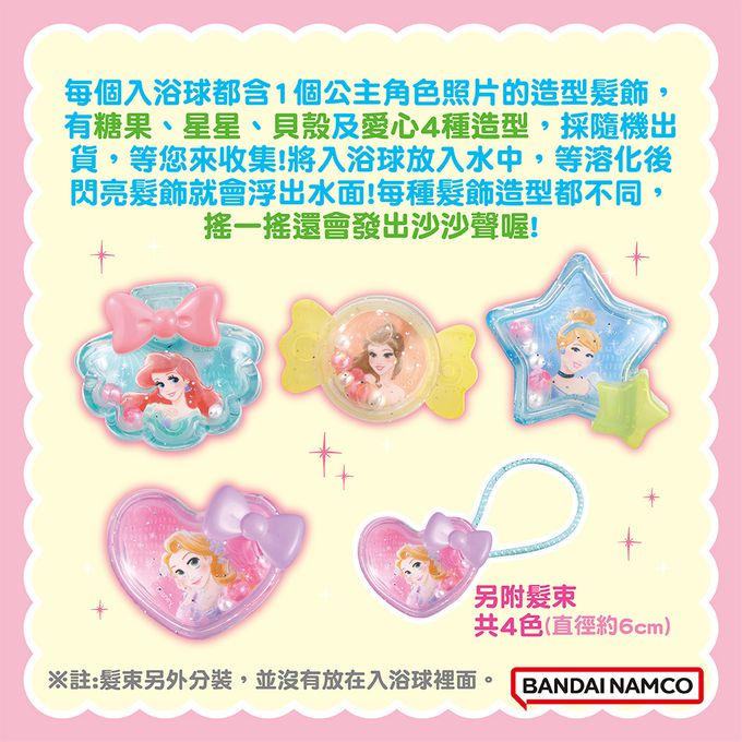 每個入浴球都含1個公主角色照片的造型髮飾,有糖果、星星、貝殼及愛心4種造型,