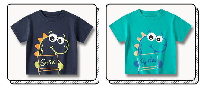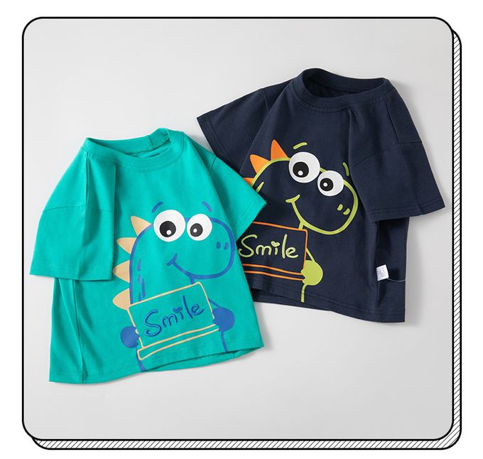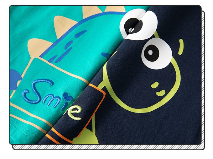 BE TOP - 純棉短袖上衣-可愛恐龍-黃藍拼袖