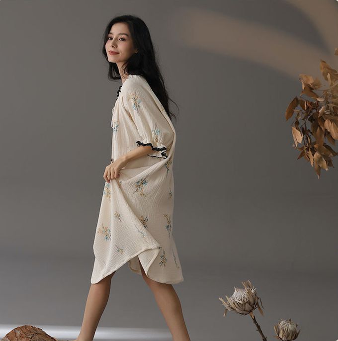 品名:沉寂極簡風花束印花全棉双層皺紗洋裝居家服