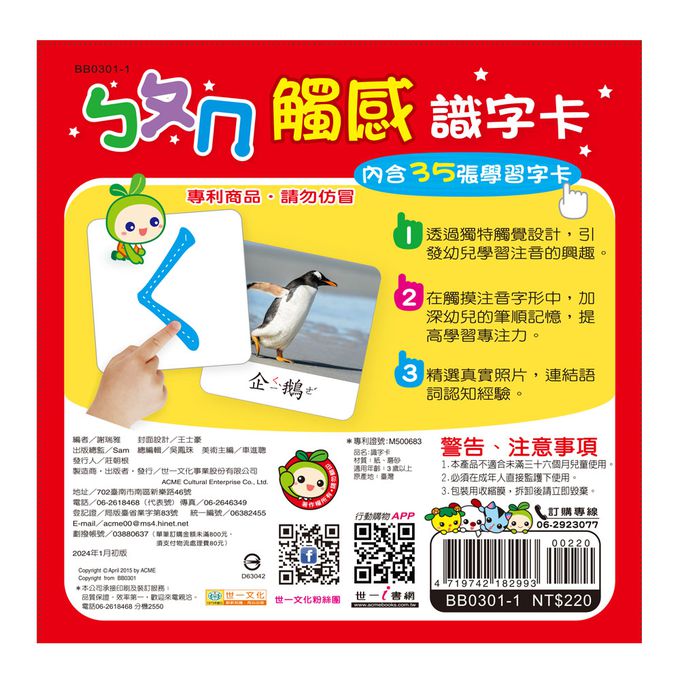 這是一盒讓幼兒透過觸覺記憶學習的字卡,專利設計清晰的筆順加上特殊觸感,讓學齡前的幼兒運用自己的食指,觸覺記憶學習37個注音筆順,字體大又清晰,搭配 豐富色彩增加幼兒學習興趣,提高學習專注力.每個注音精選真實照片,延伸學習 生活常用語詞,豐富幼兒語詞認知經驗.貼心設計輕巧尺寸及四邊圓角保護幼兒, 小巧好用方便攜帶,帶著走真方便,學習起來好放心.