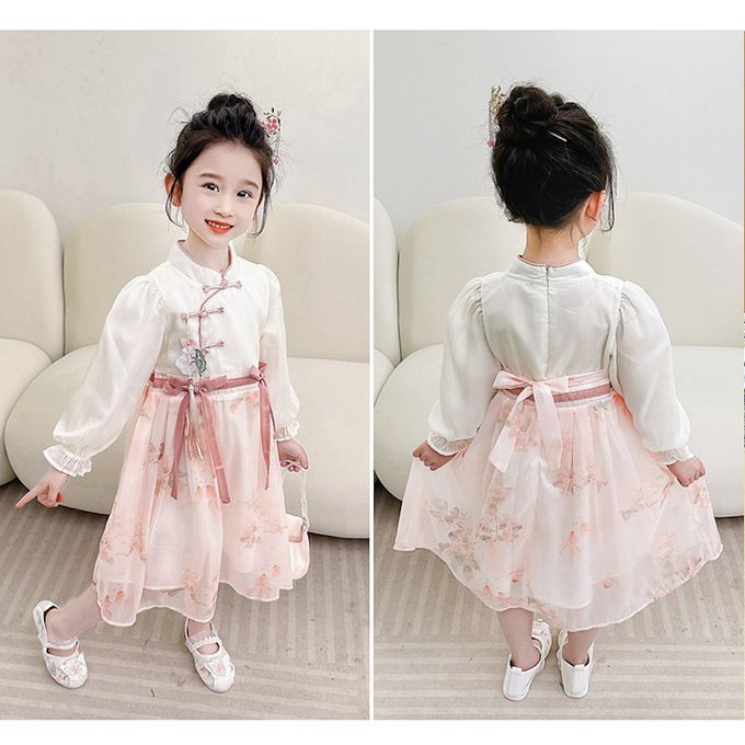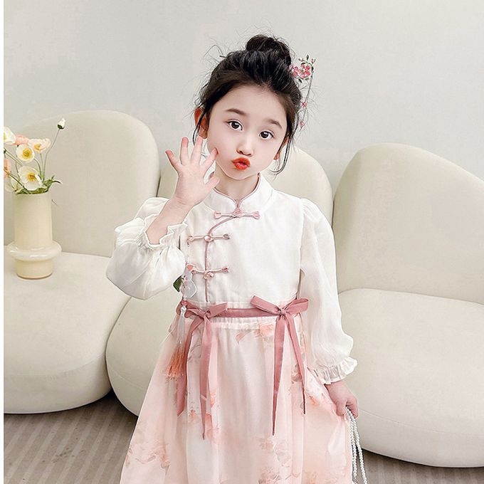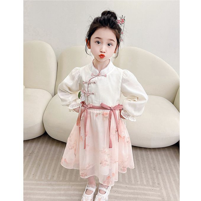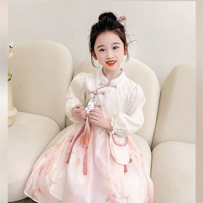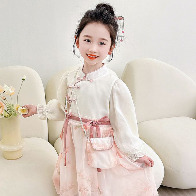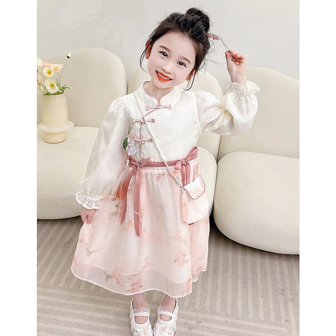 清秀古典旗袍上衣雪紡紗裙假兩件式洋裝(送珠鏈小包)-皮粉色