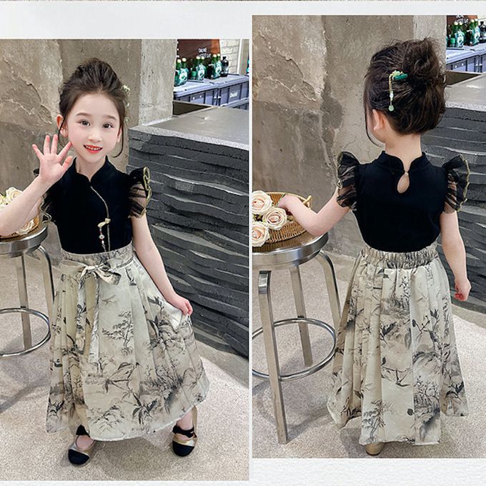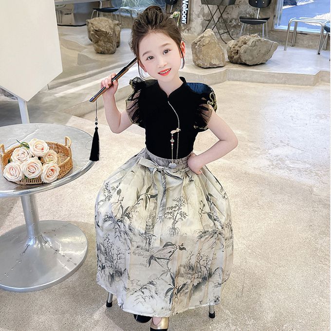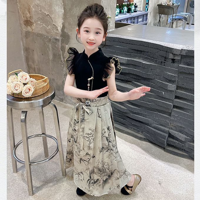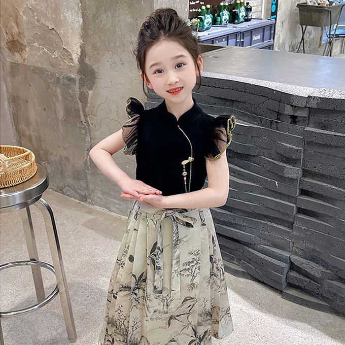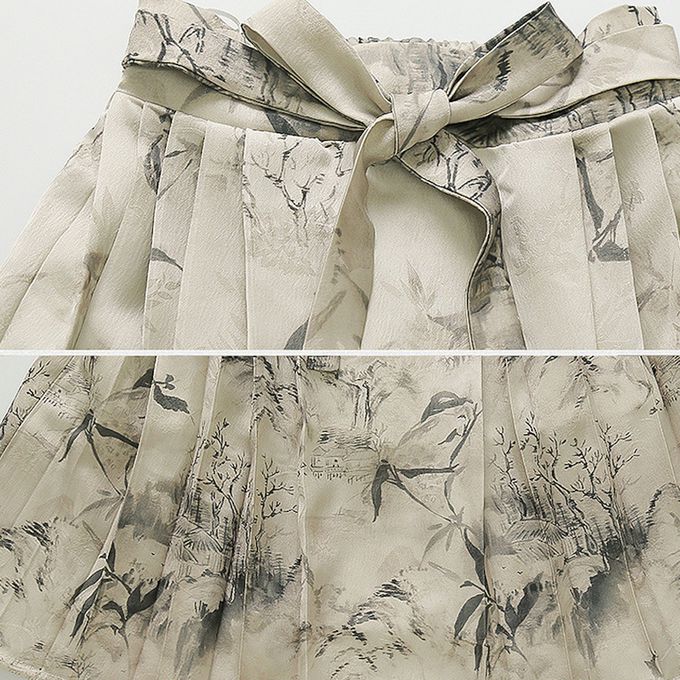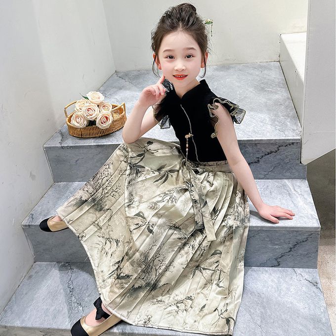 love, charlotte - 古典荷葉袖黑色旗袍領仿玉吊墜上衣配水墨畫馬面裙兩件套