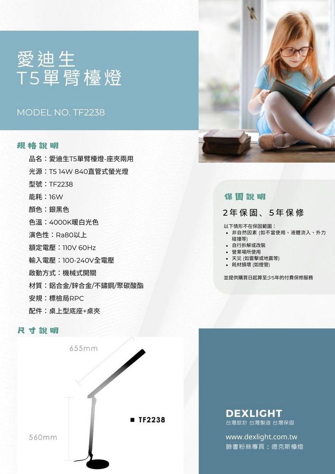 台灣製愛迪生T5單臂檯燈-初代復刻版-TF2238/ TF-2238 (座夾兩用)