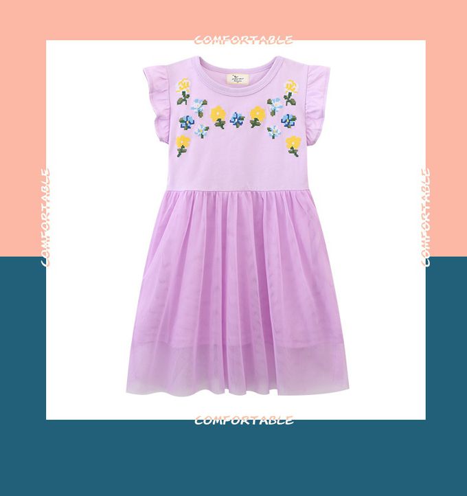 Jumping meters - 棉質圓領小飛袖網紗洋裝-繽紛花朵-紫色