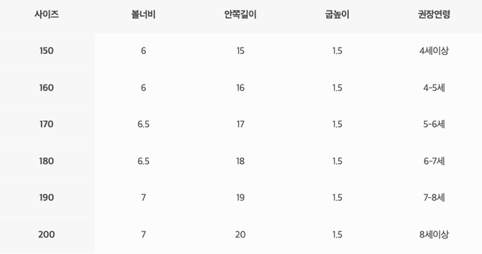 尺寸表由左至右為:尺寸、鞋寬、腳長、跟高、建議年齡