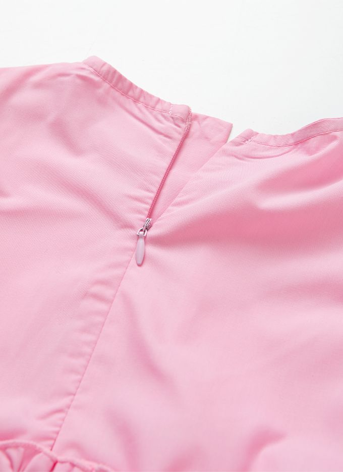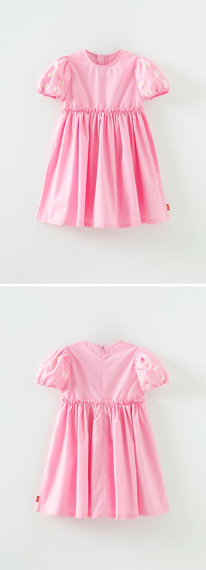 韓國 OZKIZ - 蕾絲蝴蝶結點綴泡泡袖洋裝-桃粉