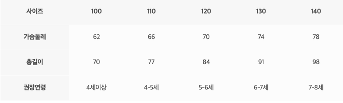 尺寸表由上而下為:尺寸、胸圍、總長、建議年齡