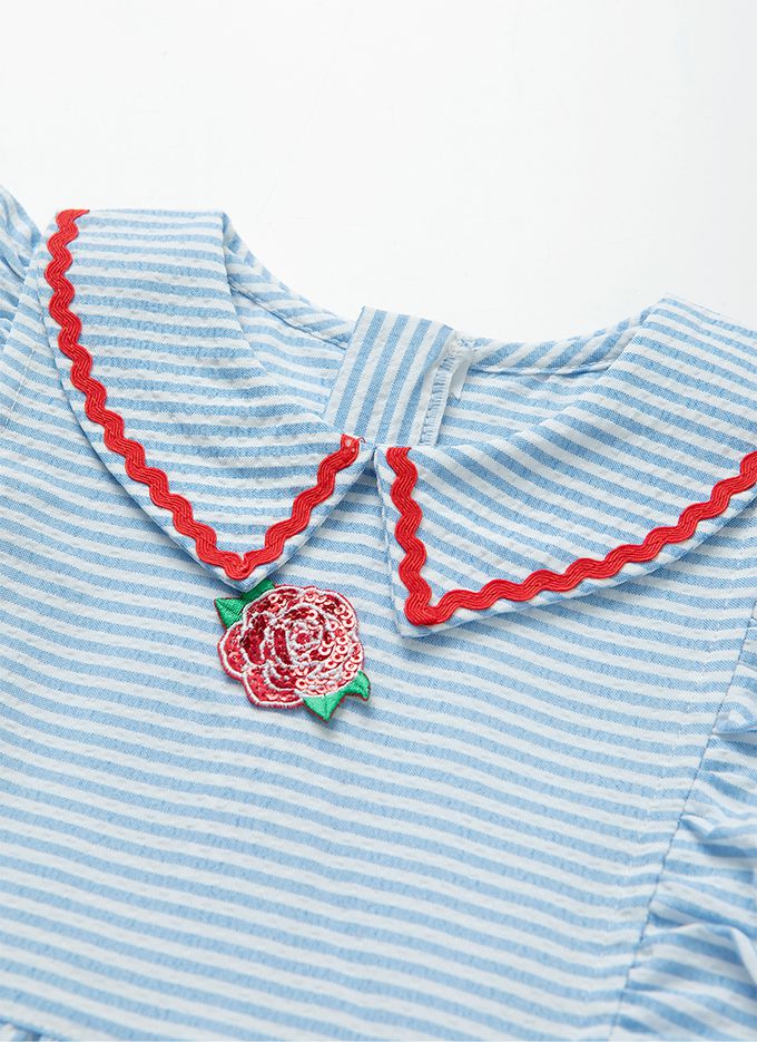 • 品名:玫瑰亮片裝飾條紋翻領洋裝