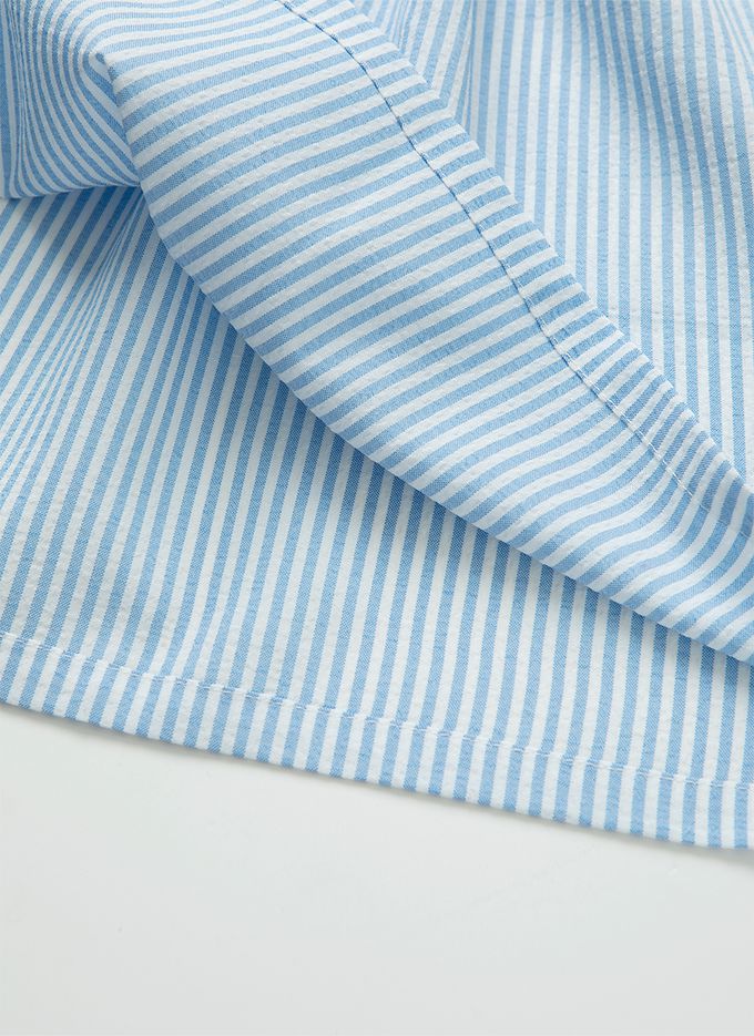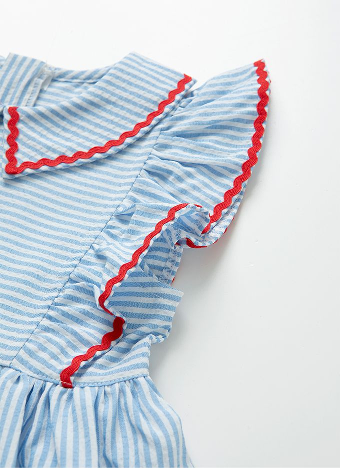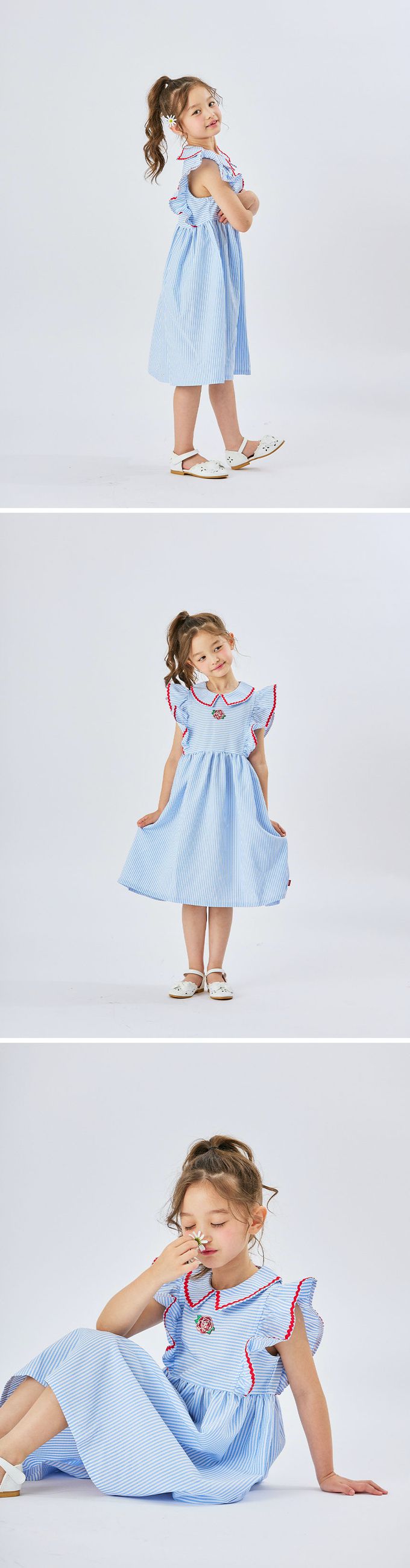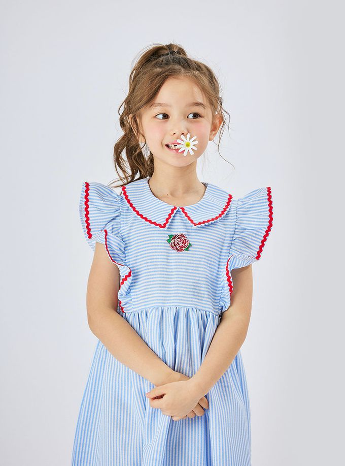 韓國 OZKIZ - 玫瑰亮片裝飾條紋翻領洋裝-天藍