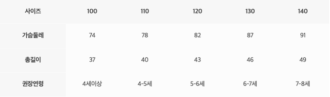尺寸表由上而下為:尺寸、胸圍、總長、建議年齡