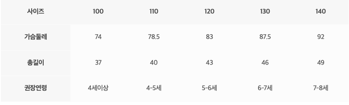 尺寸表由上而下為:尺寸、胸圍、總長、建議年齡