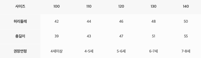 尺寸表由上而下為:尺寸、腰圍、總長、建議年齡