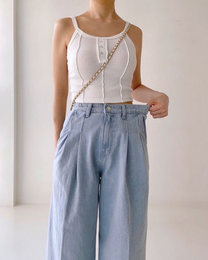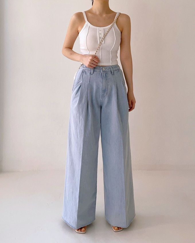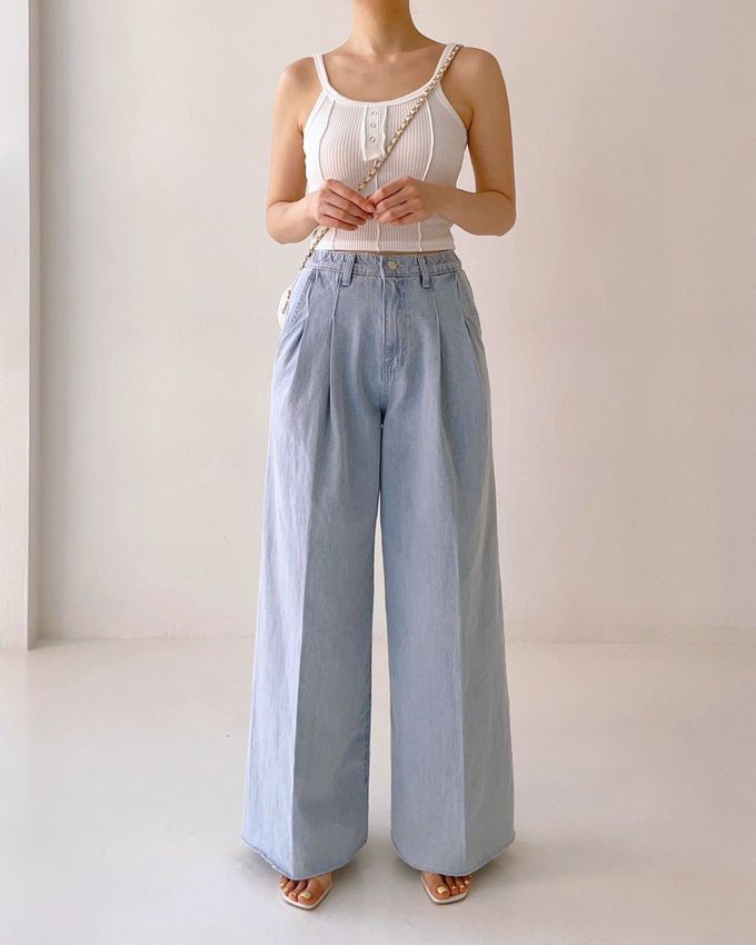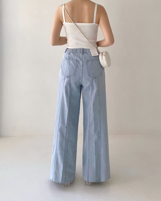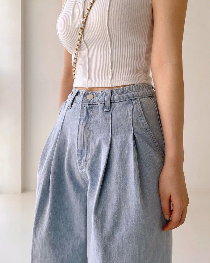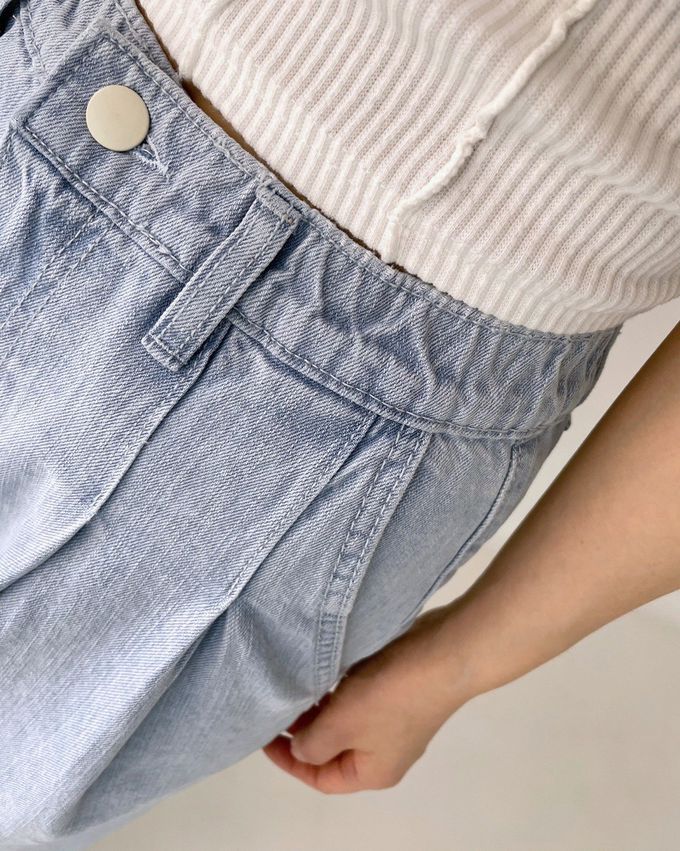 韓國女裝連線 - 彈性腰抓褶感寬鬆牛仔褲-淺藍