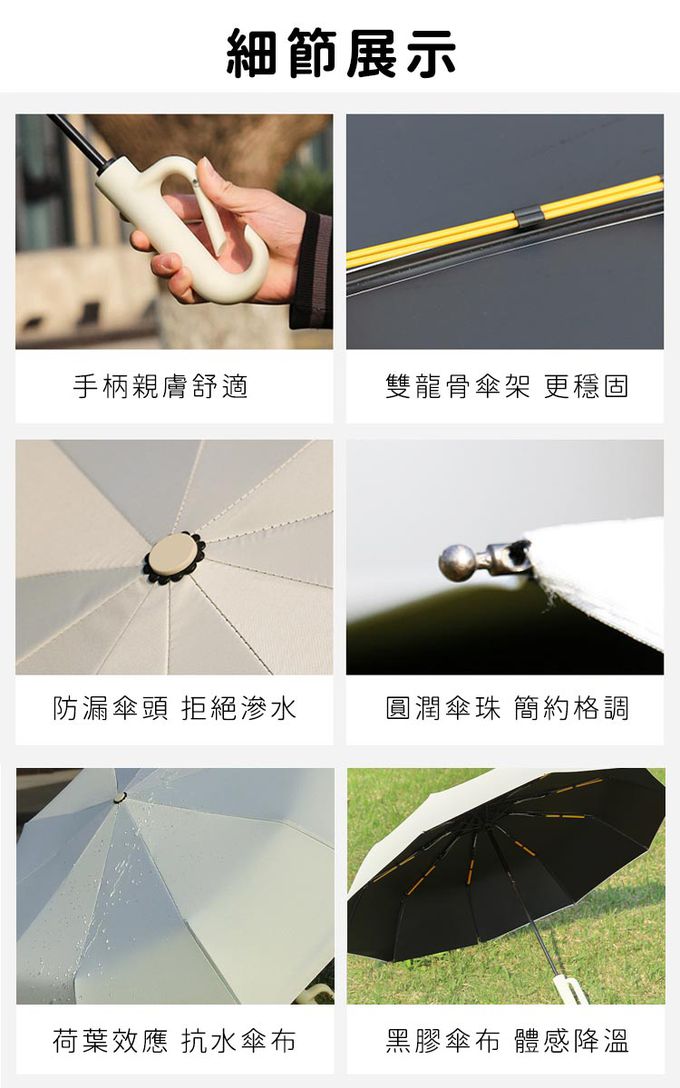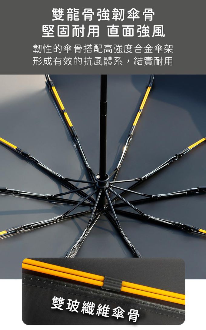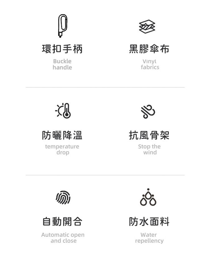 材質:傘布/210T高密度碰擊布、傘內材質/黑膠塗層、傘骨/纖維雙龍骨、中棒/合金、傘柄/ABS+橡膠塗層漆