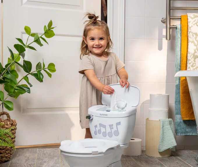 寶寶上完廁所後,按壓把⼿有擬真的沖⽔聲