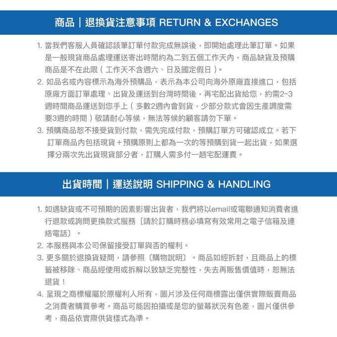 運送服務:目前提供的運送僅限台灣本島。如您位於離島地區,可能會無法配送,或須依據商品需加收離島運費。廠商亦保留出貨與否的權利。離島、偏遠地區、樓層親送等加價費用,可能會另需加收。