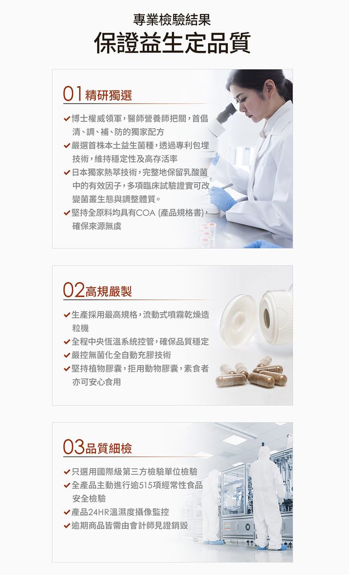 內容物成分:乳酸菌粉(L. rhamnosus BB1、L. paracasei BB5、L. plantarum、Bifidobacterium longum、L. acidophilus、 L. salivarius、L. fermentum、L. lactis、麥芽糊精、乳糖、多醣體)、靈芝子實體萃取物(Ganoderma lucidum,固態培養)、冬蟲夏草菌絲體粉末(Hirsutella sinensis,固態培養) 、比菲德氏龍根菌粉、乳酸菌(L. paracasei 、L. rhamnosus、L. reuteri、麥芽糊精)、果寡糖、菊糖